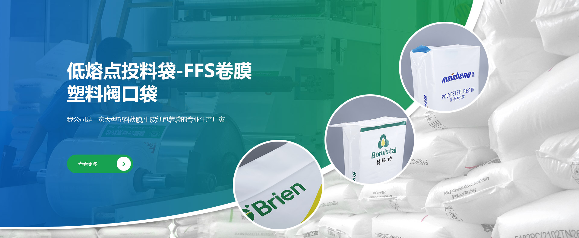 公司創(chuàng)建于1998年,是專業(yè)研發(fā)、生產(chǎn)和銷售低熔點(diǎn)橡膠投料袋、EVA閥口袋、LDPE多層閥口袋、EVA/LDPE低熔點(diǎn)膜、橡膠包裝膜、FFS重包裝袋、普通塑料包裝袋、牛皮紙閥口袋等產(chǎn)品的綜合包裝類企業(yè)